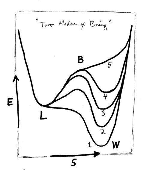 The single-variable “free-energy” function that I will draw has a y-axis labelled “E”, which is excess metabolic energy expenditure that the individual needs to use in changing their circumstances on the road to transitioning between modes of being. “E” is analogous to the so-called free energy in physics and chemistry. However, it is excess energy expenditure (or effort) and is therefore on a per-unit-of-time basis for the individual. It is a rate of energy expenditure. It is an “excess” rate because there is always a basal metabolic rate of energy expenditure simply to sustain the life of the inactive individual (beating heart, etc.).